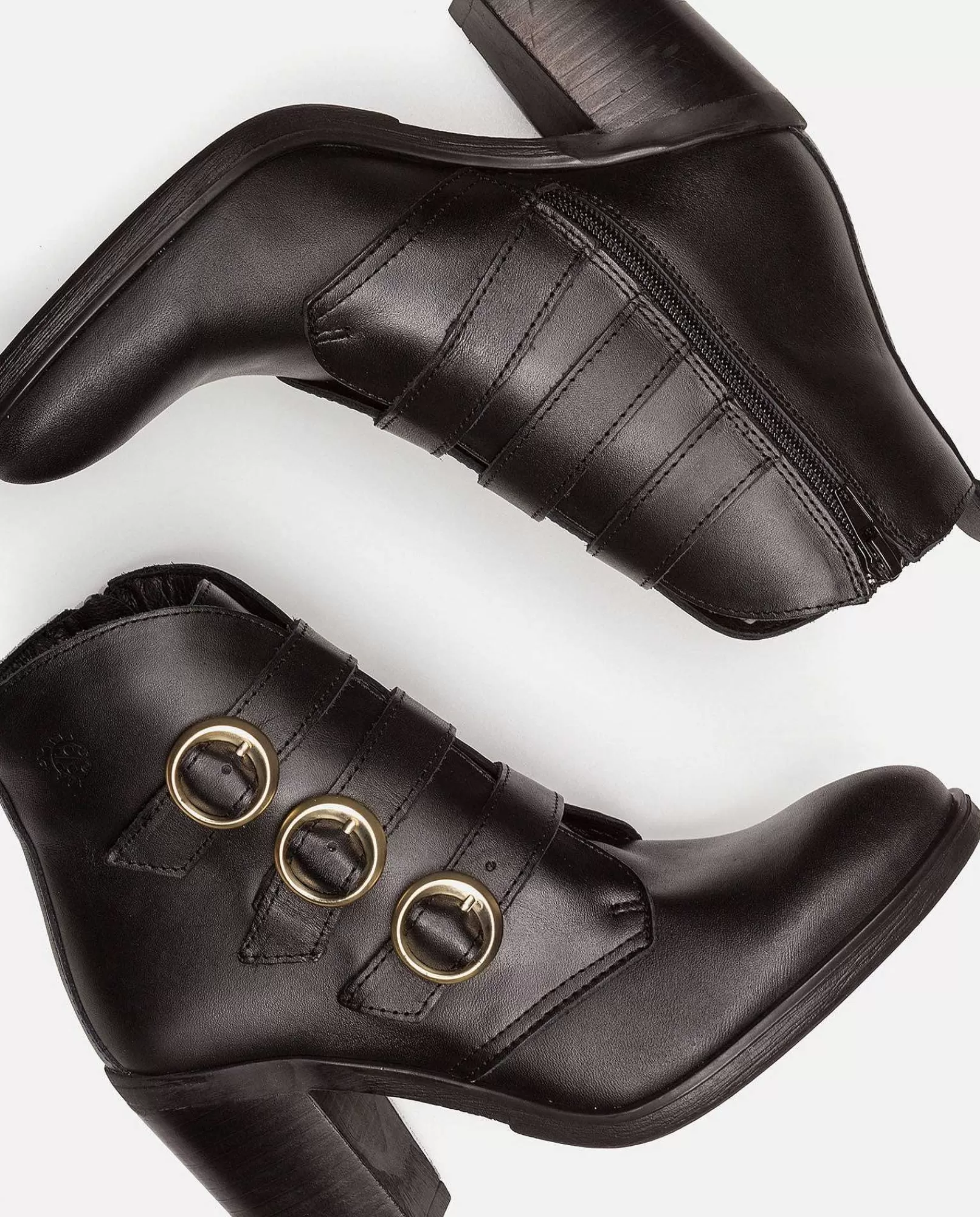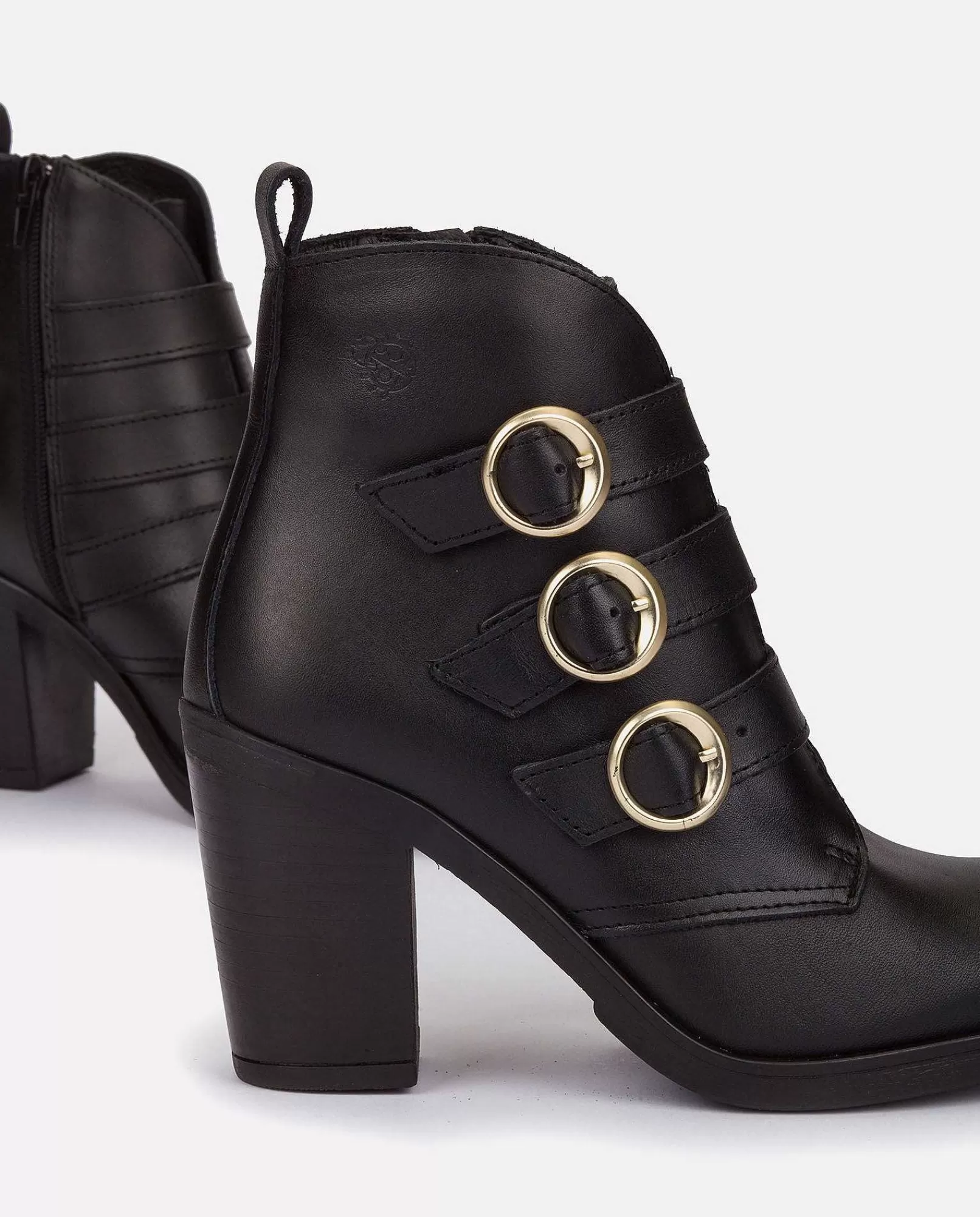 Botín De Color Negro Con Un Tacón De 8 Cm Con Corte Exterior De Piel Vacuna Y Detalle De Tres Hebillas Doradas, Interior De Piel Porcina Y Textil Que Garantiza El Máximo Confort. Fabricada En España. Pura Elegancia. Detalle En Cascada En El Corte Superior. Gran Flexibilidad. Plantilla Acolchada Y Antideslizante Que Añade Un Extra De Comodidad. Elaborada Mediante Un Proceso De Fabricación Artesanal Que Usa Tintes Vegetales Y Embalajes Sostenibles Para Respetar El Medio Ambiente.