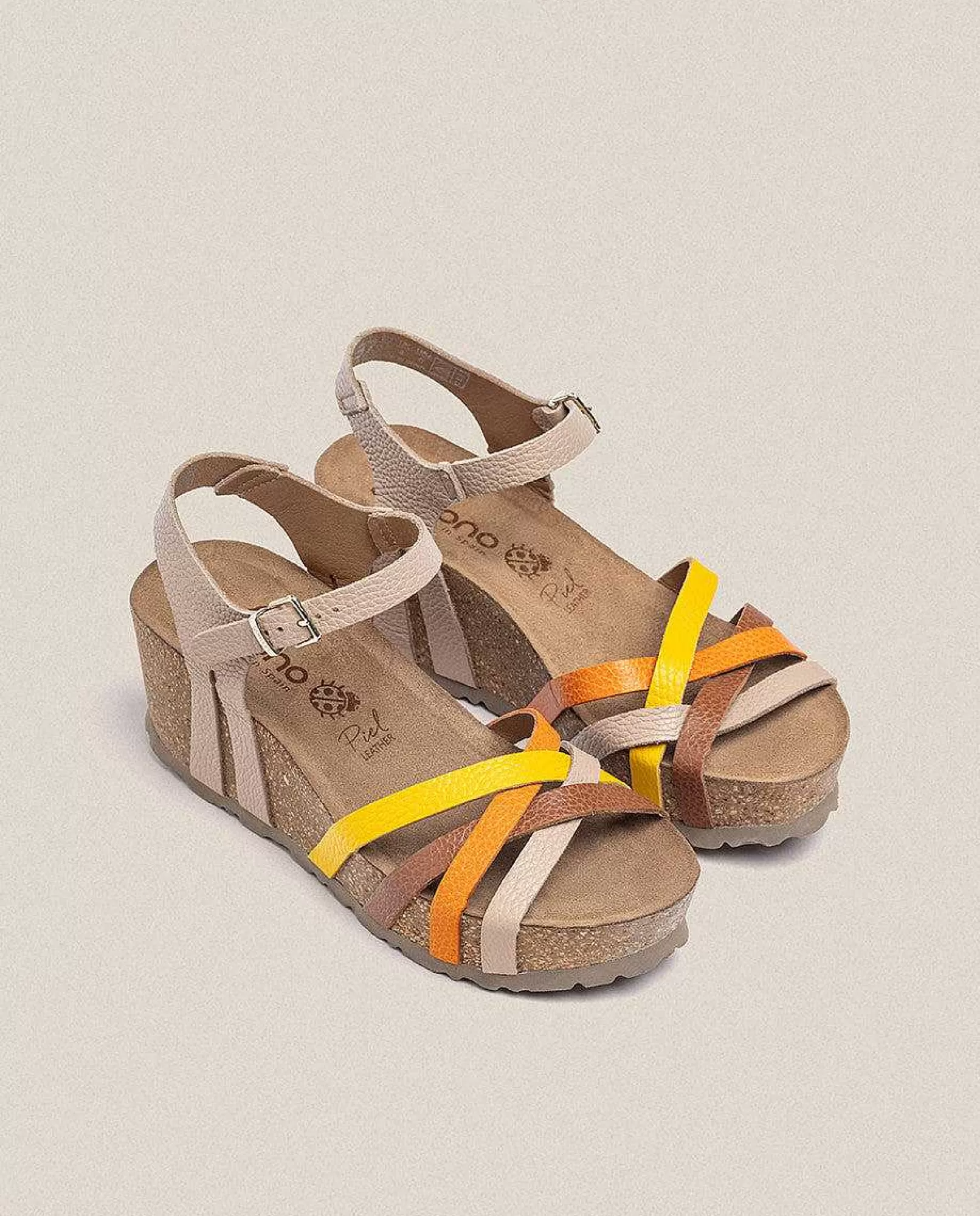 La Sandalia De Cuña Bari 302 En Beige, Compuesto Por Una Serie De Tiras Multicolor Que Sujetan Los Dedos Y Un Cierre De Hebilla Que Facilita El Calce. Tiene Una Suela De 5,5 Cm Y Una Plantilla Acolchada Y Antideslizante Que Garantiza El Agarre Del Pie. Está Elaborada De Manera Artesanal En España Mediante El Uso De Tintes Vegetales Respetuosos Con El Medio Ambiente.