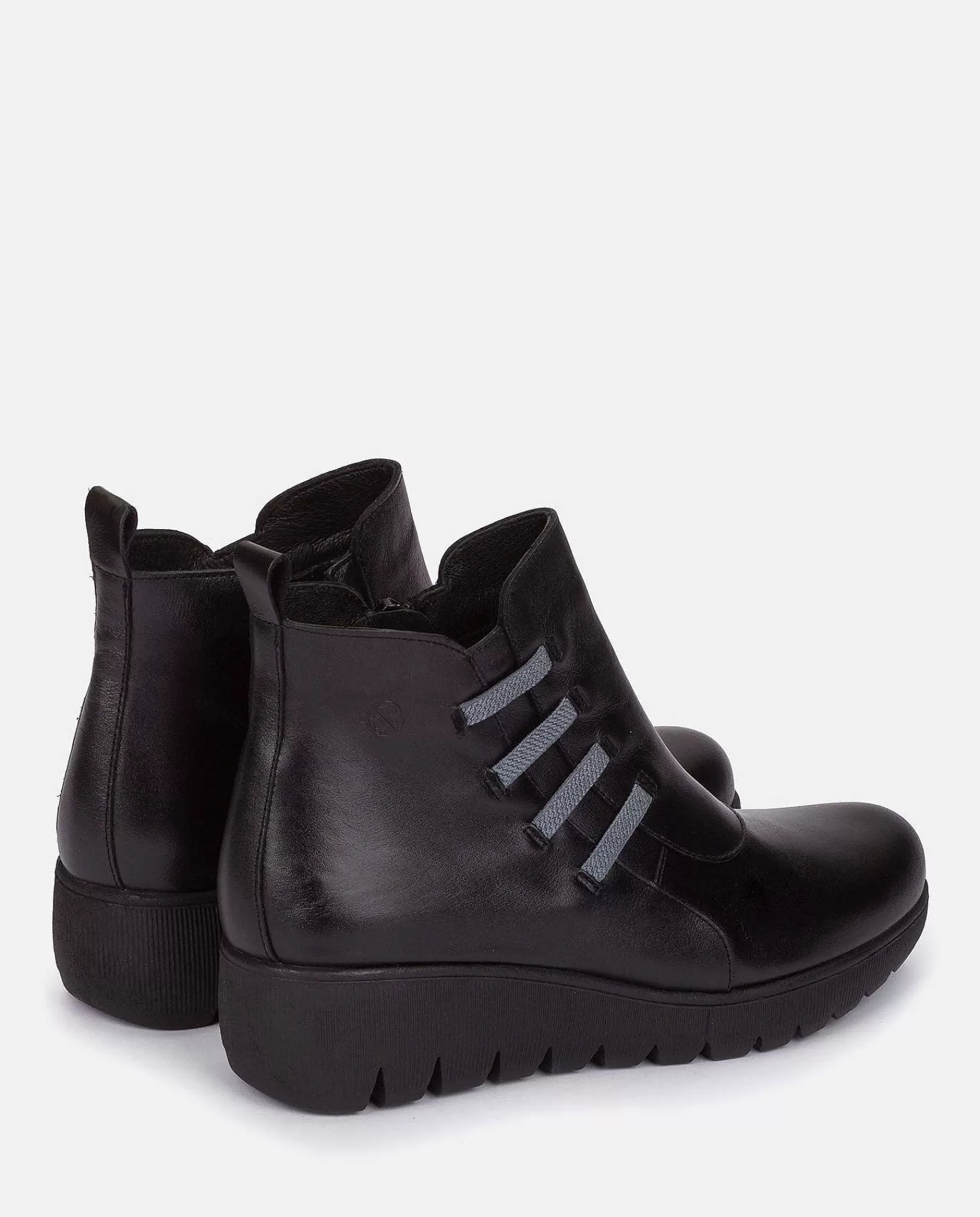 Botín Plano Con Una Suela De 3 Cm, Cómodo Y Flexible. El Modelo Atenas 033 En Negro Está Elaborado De Manera Artesanal En España, Corte En Piel Vacuna Y Cordones Decorativos En El Lateral. Fabricado De Manera Sostenible Y Mediante El Uso De Tintes Vegetales Respetuosos Con El Medio Ambiente.