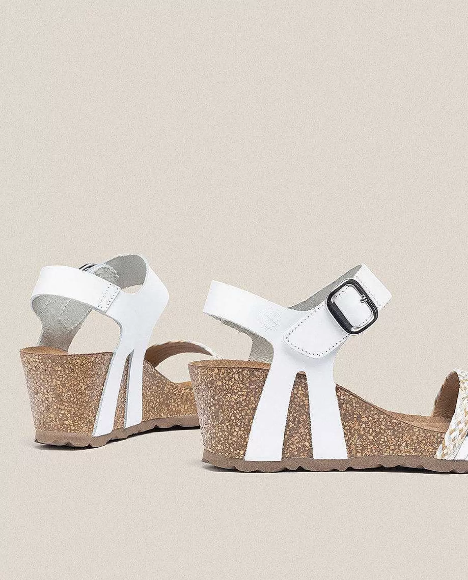 La Sandalia De Cuña Cadiz, Esta Vez Con Detalles Llamativos En La Tira Delantera Que Sujeta Los Dedos. Color Blanco Y Cierre De Velcro Con Hebilla Decorativa Para Facilitar El Calce. Tiene Una Cuña De 5,5 Cm Y Una Plantilla Antideslizante Que Garantiza El Agarre. Está Elaborada De Manera Artesanal En España, Material De Piel Y Uso De Tintes Vegetales Respetuosos Con El Medio Ambiente.